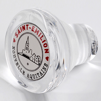 Notre élégant bouchon en verre estampillé de notre visuel Saint-Emilion-Nouvelle Aquitaine est une bonne alternative aux bouchons en liège.